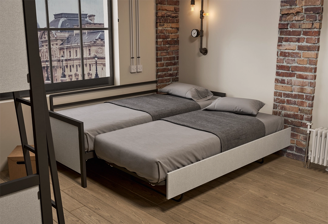 Il divano letto Astro ottimizza ogni ambiente con un design elegante, che offre comfort e funzionalità grazie alla possibilità di integrare un letto estraibile aggiuntivo.
